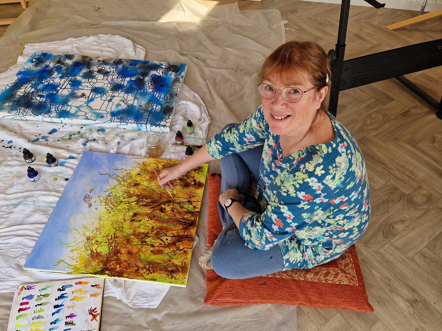 I am Lucky to have a Studio in the garden where I can go to paint and create without having to tidy up all the time (thank goodness). A you can see I work on the floor sometimes as well as on easels standing and sit at tables depending on what I am painting.